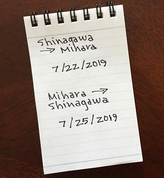• Center the bullet train segments on your screen and take a screen shot. Write the dates you want to leave and return on a piece of paper, along with the bullet train departure station and the final bullet train arrival station, like this: