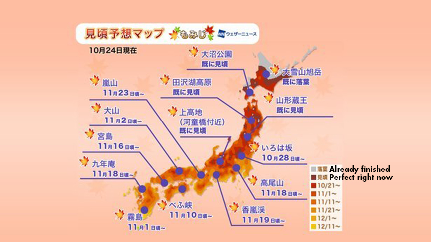 You don’t have to be in Tokyo or Kyoto for that crowded two-week window from mid-to-late November, when leaf viewing is at its best. Here’s the 2019 map predicting when peak season is going to hit other regions of Japan: