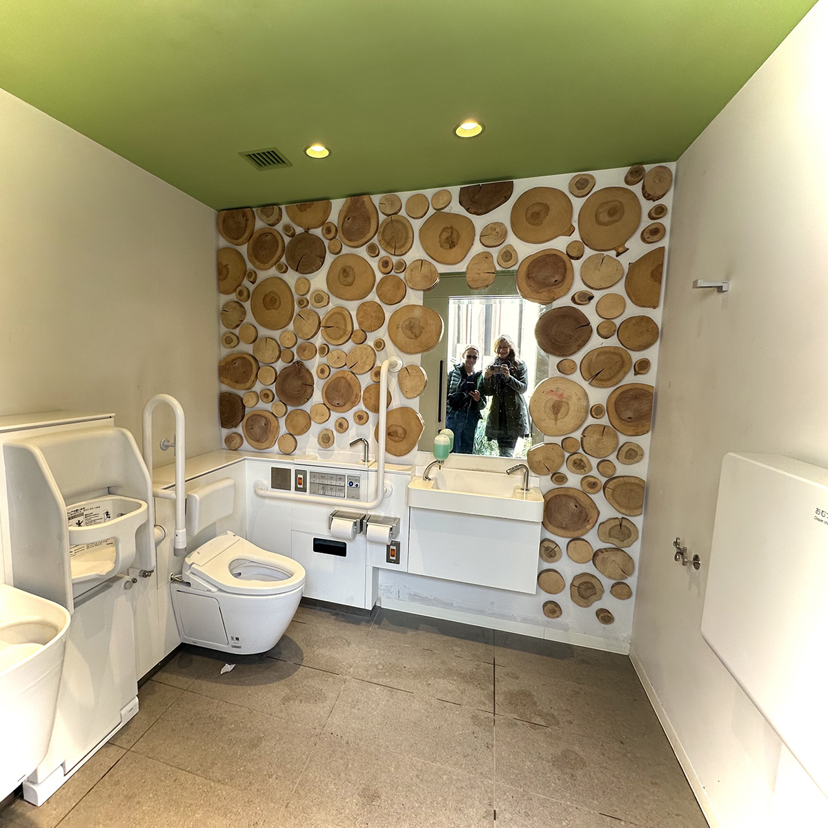 Check out the adorable moon and rabbit design elements! The two smaller cylinders on the right (behind that low, white, handwashing basin) are for kids. Don’t miss peeking inside at the pint-size toilet and urinal!