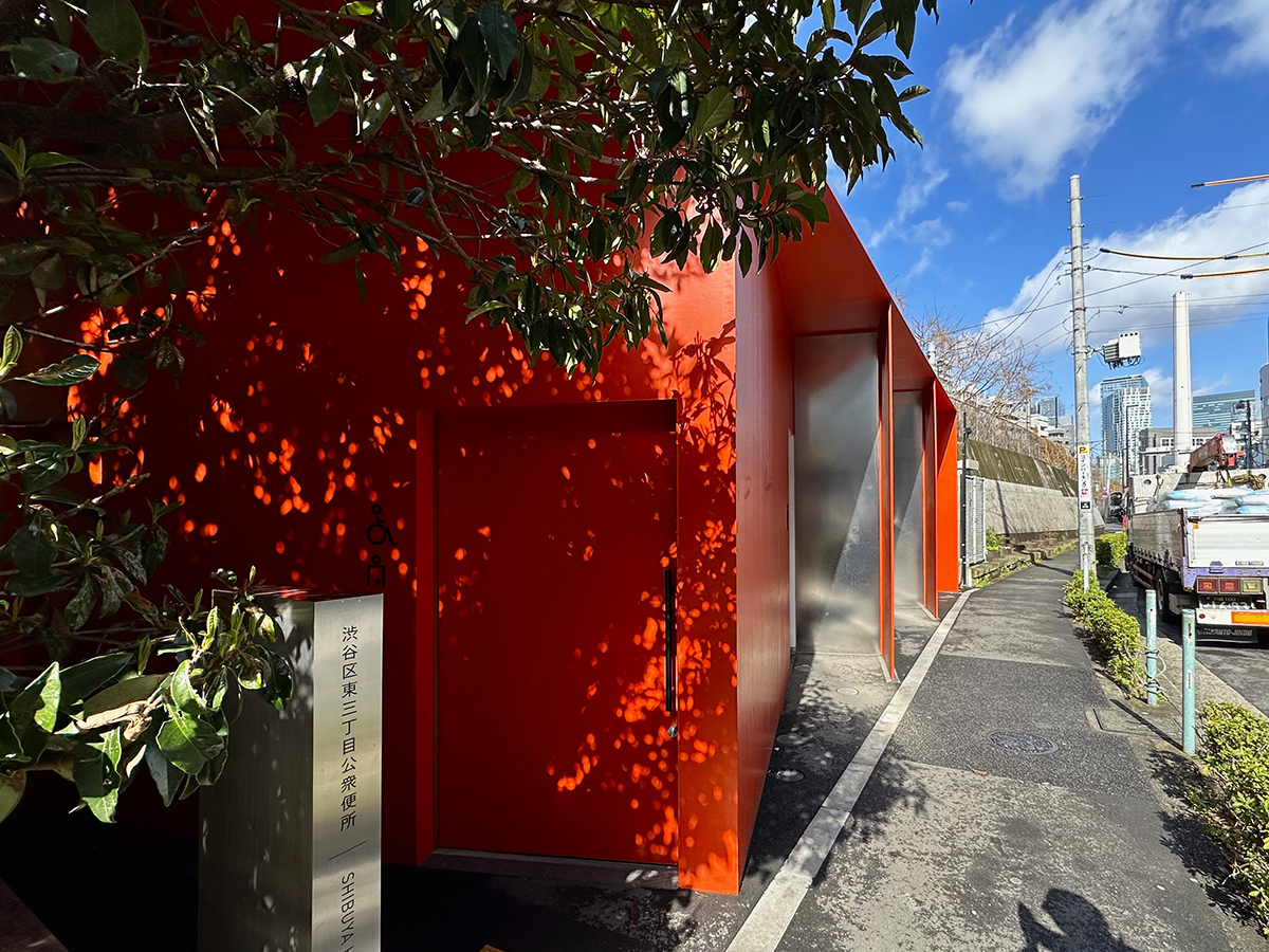 Approaching from the front, you’d never know this was a public toilet. The sharply angled entrances allow this deceptively simple red box to serve three users at a time with luxurious privacy, even though it sits on a strip of land so narrow, it’s a miracle they can put a public toilet there at all.