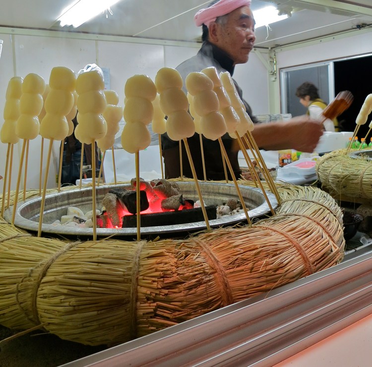 During leaf season and cherry blossom season, they often have special food stands set up in the park, selling traditional foods like skewers of roasted mochi (sticky rice cakes) dipped in soy or miso sauce, and tonjiro (a hearty soup made with bacon and vegetables).