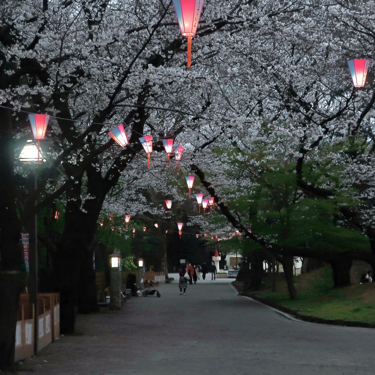 and lanterns strung through the trees invite everyone to enjoy themselves at hanami parties in the evening.
