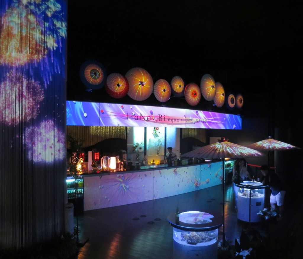 and a flurry of animated snowflake art is projected onto the bar and the tables filled with exotic fish.