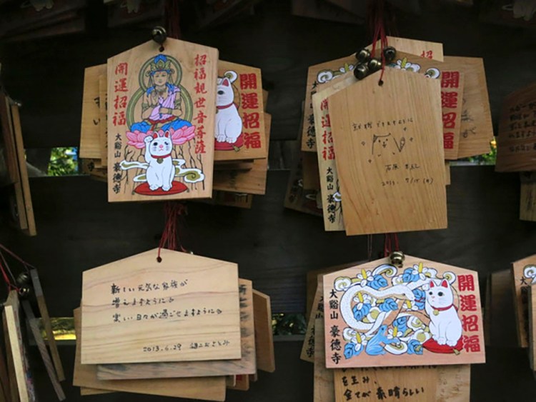 Even the prayer plaques at Gotokuji feature cats. My favorite one, though, is the one someone drew on the back of the ema in the upper right!
