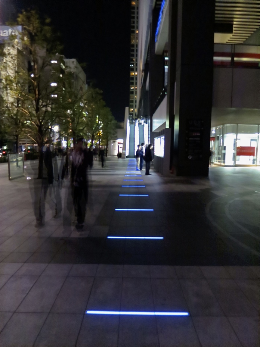 On the corner near the UDX building, a mysterious path of blue neon bars leads up up the stairs to the Anime Center, and beyond.