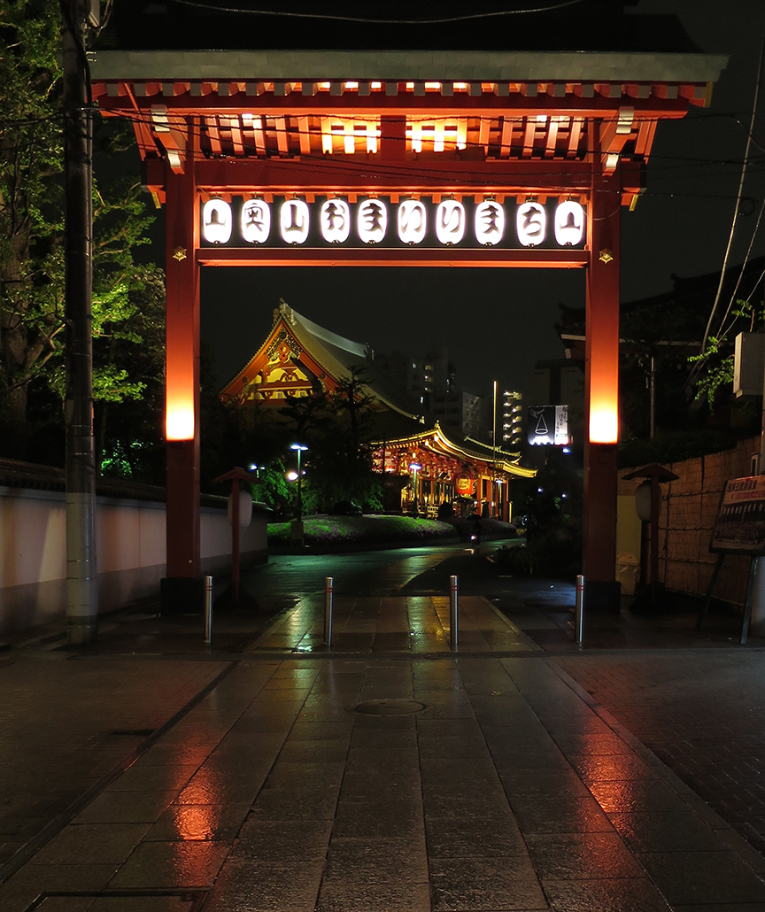 And don’t forget to come back at night! At night Senso-ji temple is lit up like an amazing stage set. The side gate lighting changes color as you watch…
