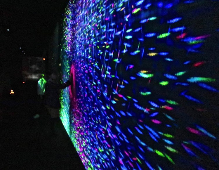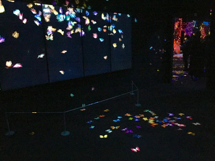 Much of it in interactive, like this school of fish that scatter when you touch the wall, then change color and circle around the point of contactThe Crystal Universe maze (made of everchanging strings of programmed LED lights) will react to commands from your cellphone app, sending burst of fire or rain or swiftly-growing forests all around you as you wander through itIn this mirrored room, a constantly changing laser light show happens all around youAnd in this one, if you stand still, butterflies generate on your chest, then fly across the floor and up onto the wall, set free to wander throughout the buildingAs an added delight (one you shouldn’t miss), for ¥500 you can sip a bowl of tea at the En Tea House, while bouquets of flowers kindle and bloom atop your bowl