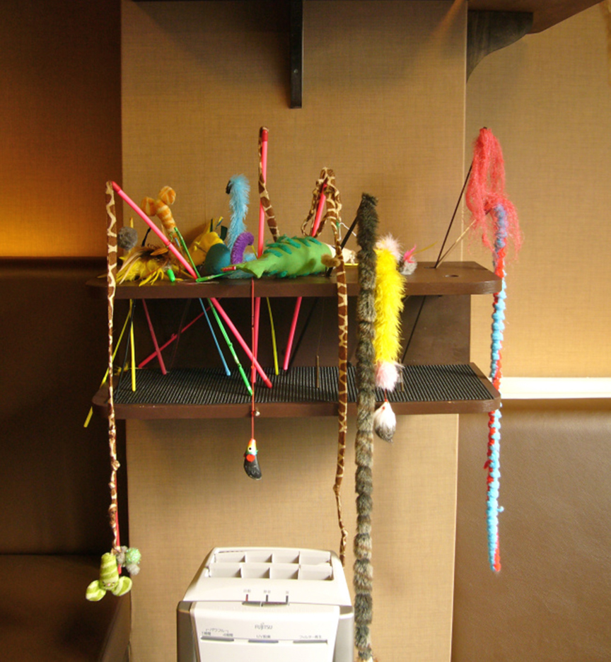 Previous Image Next Image CatCafeToys Cat toy stations are strategically placed around the room, to help you tempt a cat to acknowledge your existence.