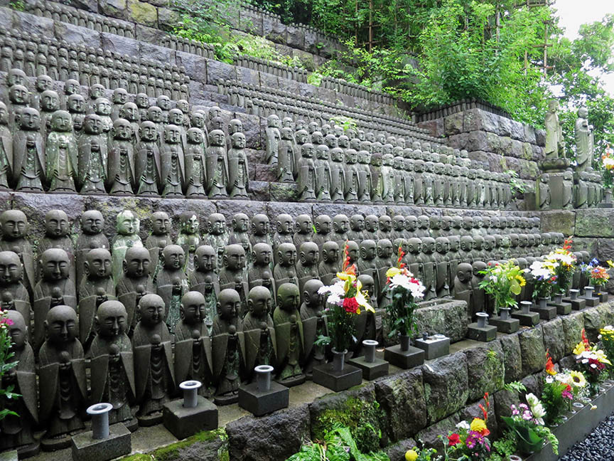 Although Hasedera is known for its nine-meter-tall Kannon figure* my favorite deities are the thousands of Jizo figures clustered all over the grounds. Let’s wend our way up the hillside behind the temple buildings and see some of them on the way.