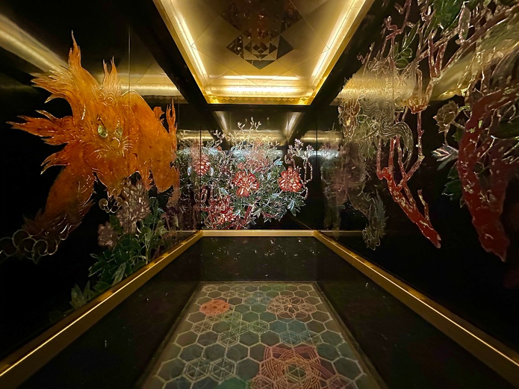 The Hotel Gajoen Gallery is well worth seeing even when it’s not hosting an exhibit, because the gallery itself is a work of art! You know you’re in for an Experience with a capital “E” the moment you step into the elevator, which is a jewel box of polished lacquer inlaid with mother-of-pearl. The over-the-top opulence feels un-Japanese until you start noticing the details…