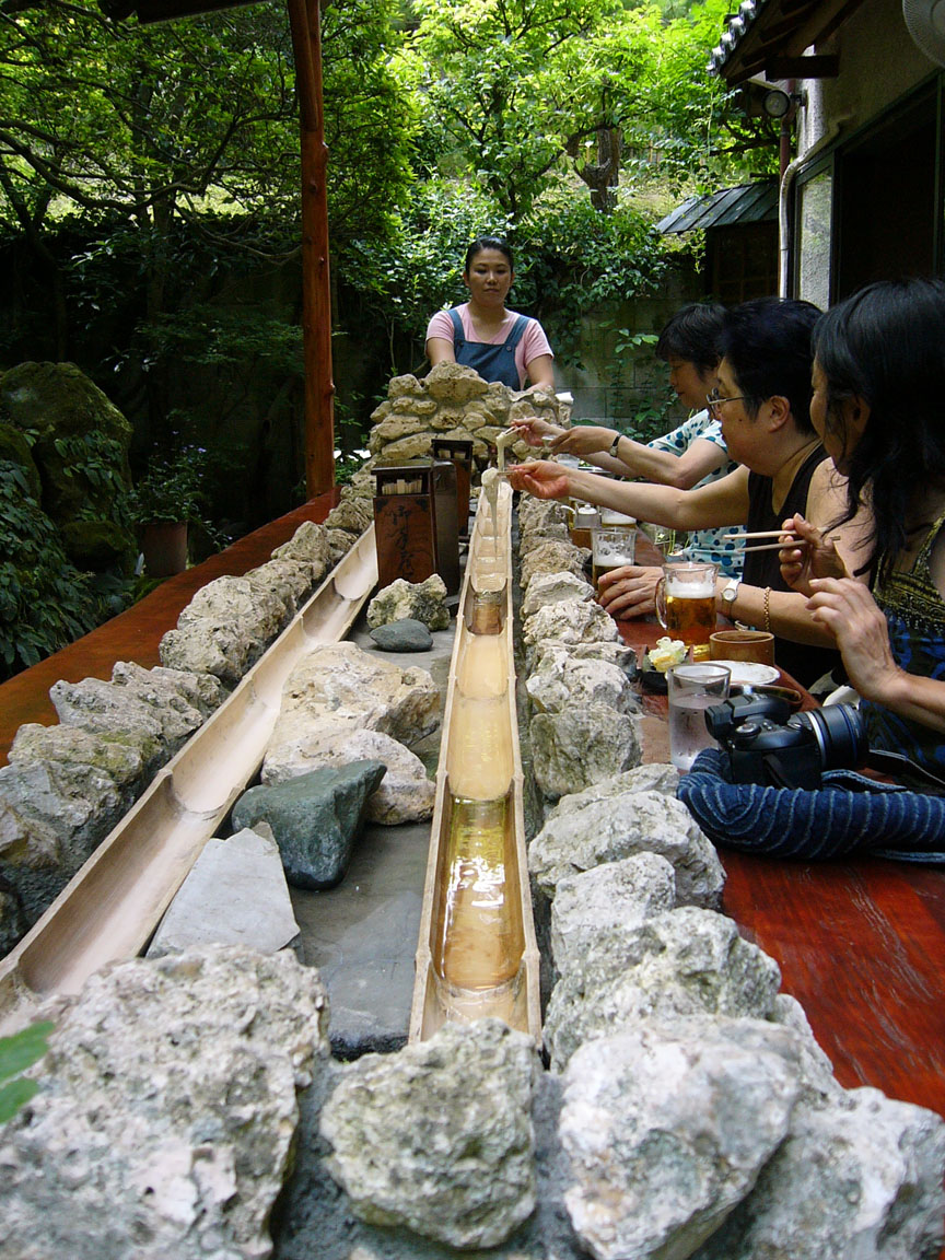 Are you hungry yet? Okay, let’s eat some noodles! From May to October, we can catch our own as they float down the middle of the table at Chaya Kado.
