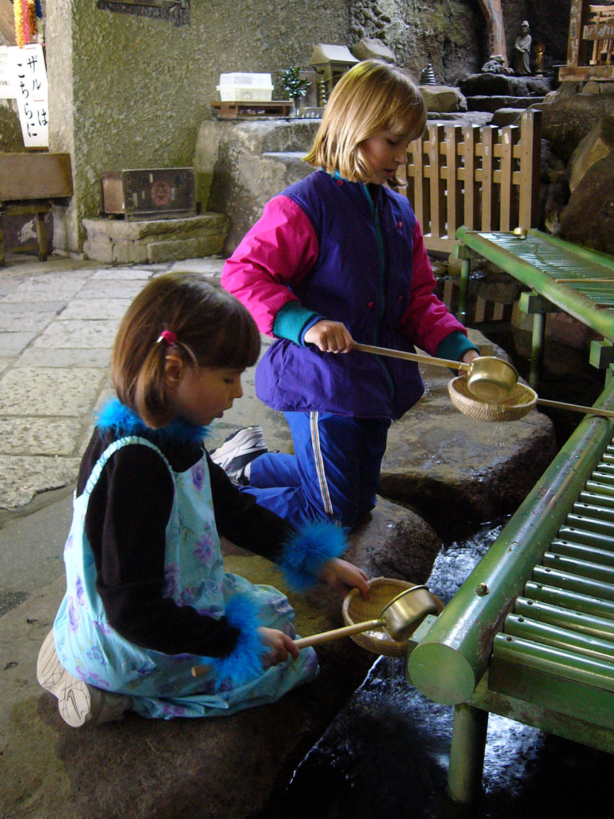 Let’s go to the far side of the grotto to the cave with the money-washing stream running through it. We’ll stop at the shrine stand counter to make a ¥100 donation, and the monks will give us baskets for our money. After we put our money in the baskets, we’ll go into the cave and use one of the dippers to pour water from the stream over it.