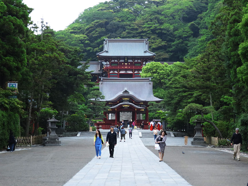 Back near Kamakura Station, the big main street through town leads to the Tsurugaoka Hachimangu Shrine. Built for the shōgun in the days when Kamakura was the capital, it’s an elaborate red and gold-style shrine with famous lotus ponds that bloom in July. A shrine worthy of the shoguns, this is also a great place to see traditional weddings being performed, because they happen in an open pavilion near the shrine entrance.