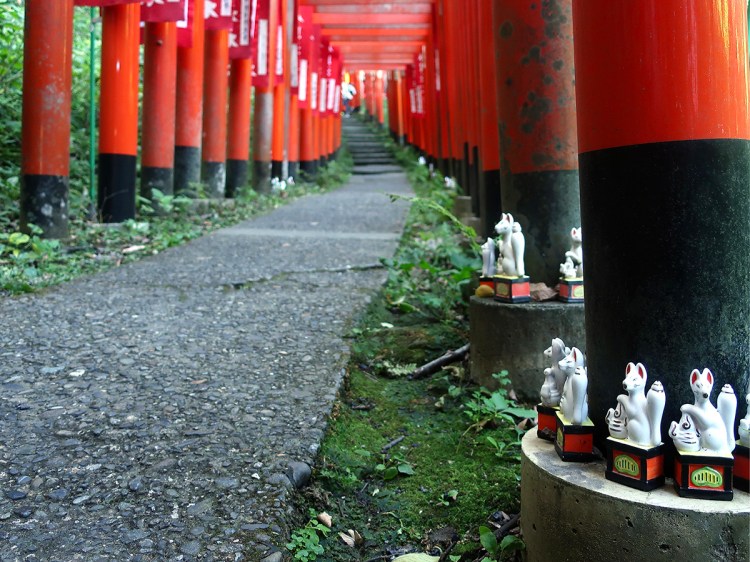 The thousands of foxes in the villages and on the altars of the many sub-shrines were bought by pilgrims and left there as offerings, along with prayers for their hearts’ desires. For as little as ¥1500 for the smallest pair, you can add to the population or take them home (which is unusual, since taking sacred items away is not always allowed at shrines.)