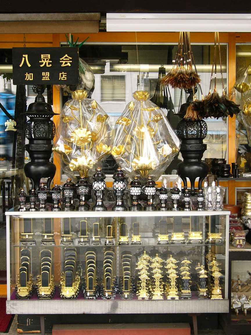 Bonus only-in-Japan experience: As we turn the corner to go back to Tawaramachi Station let’s cross over to the other side of the big street. We’ll pass a few funeral goods stores filled with wooden Shinto shrines, Buddhist home altars, gold temple chandeliers, Buddhist rosaries, incense, and religious statues.