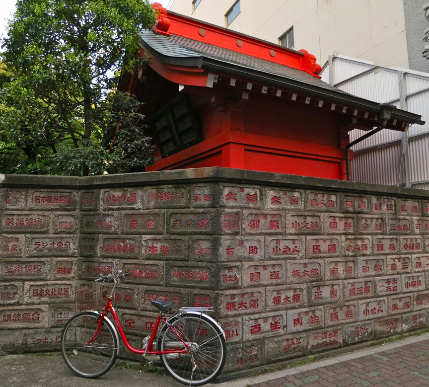Right before we get to the station, let’s duck into the little street branching off to the right and stop in at the Rakugo Shrine! Rakugo is traditional Japanese comic storytelling, with a long history of wandering actors entertaining the townsfolk of yore. But during WWII, fifty-three of the most famous rakugo stories were entombed at this shrine forever, deemed too funny to be performed at a time of national crisis. The names carved in red on the wall outside are the stage names of famous rakugo performers from yesteryear.