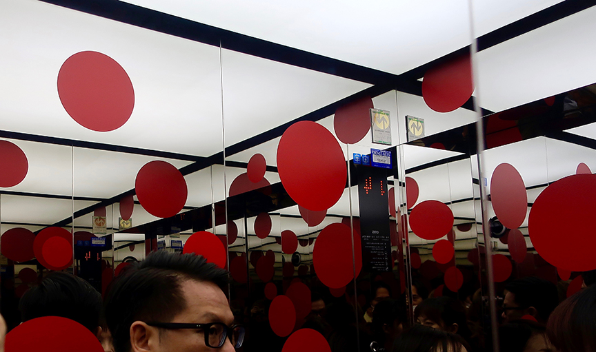 Photos weren’t allowed on the third floor, so I borrowed one from TokyoArtBeat (below left) to show you the mirrored sculpture “The Passing Winter” (2005), which allows visitors to view the surrounding paintings in an entirely crazy (and typically Kusama) way. The shot on the right is what you see if you look inside!
