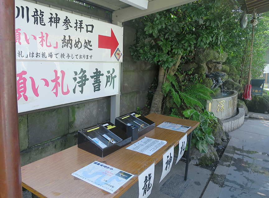 Previous Image Next Image MonzenDragonHowTo The table for buying paper and writing wishes is to the left of the fountain.