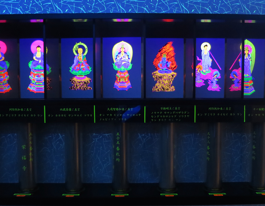Every one is different (that fiery guy is a representation of Fudo-san himself). Beneath each painting is an offering box and a prayer wheel you can spin.