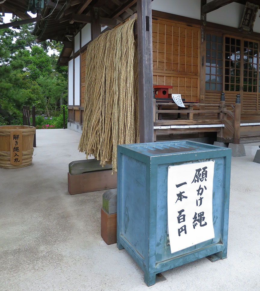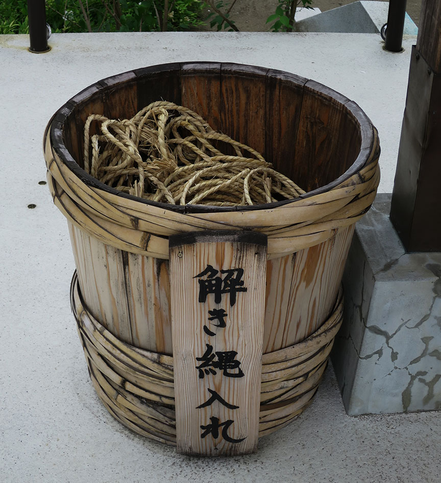 When your wish comes true, return to the temple, make another offering to thank the Shibarare Jizo, untie one of the ropes and leave it in this bucket. Looks like he’s been busy lately!