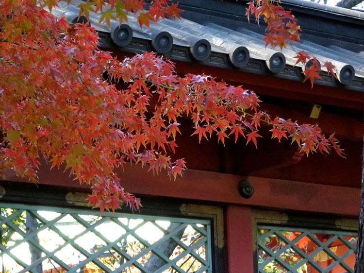and torch-on-fire gingko trees making a bright backdrop for the colorful shrine buildings.