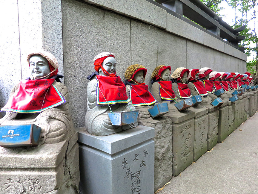 Between the train station and the main temple is a courtyard with strangely compelling Jizo figures. Unlike most Jizo statues, each one of these has a different face and expression. I believe they represent real people – perhaps the temple’s abbots – but haven’t yet been able to find out who they are.