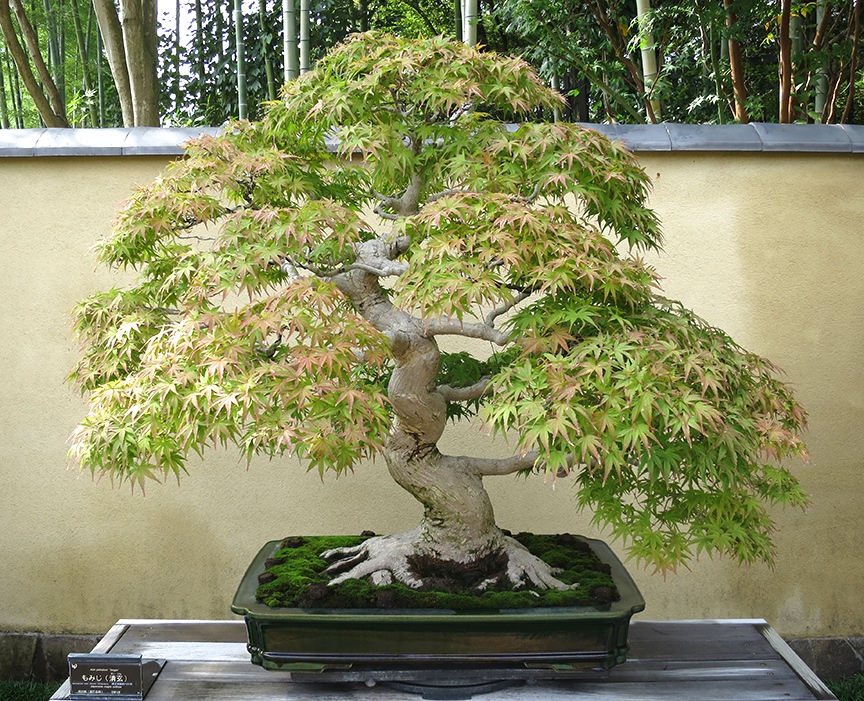 Previous Image Next Image ShowaBonsai A walled courtyard near the pond displays ancient specimens of bonsai, in many varieties.