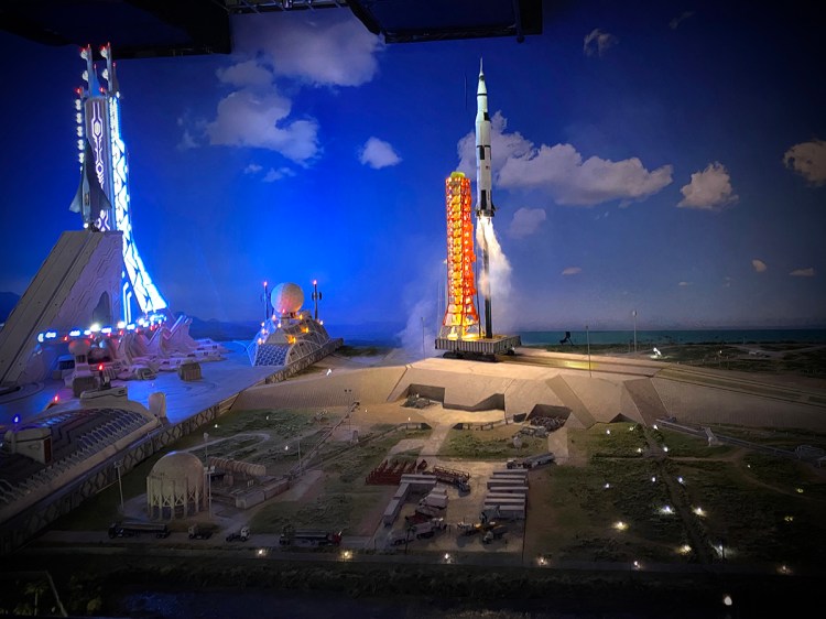 with rockets that trundle over to the launchpad and depart periodically, blasting real steam.