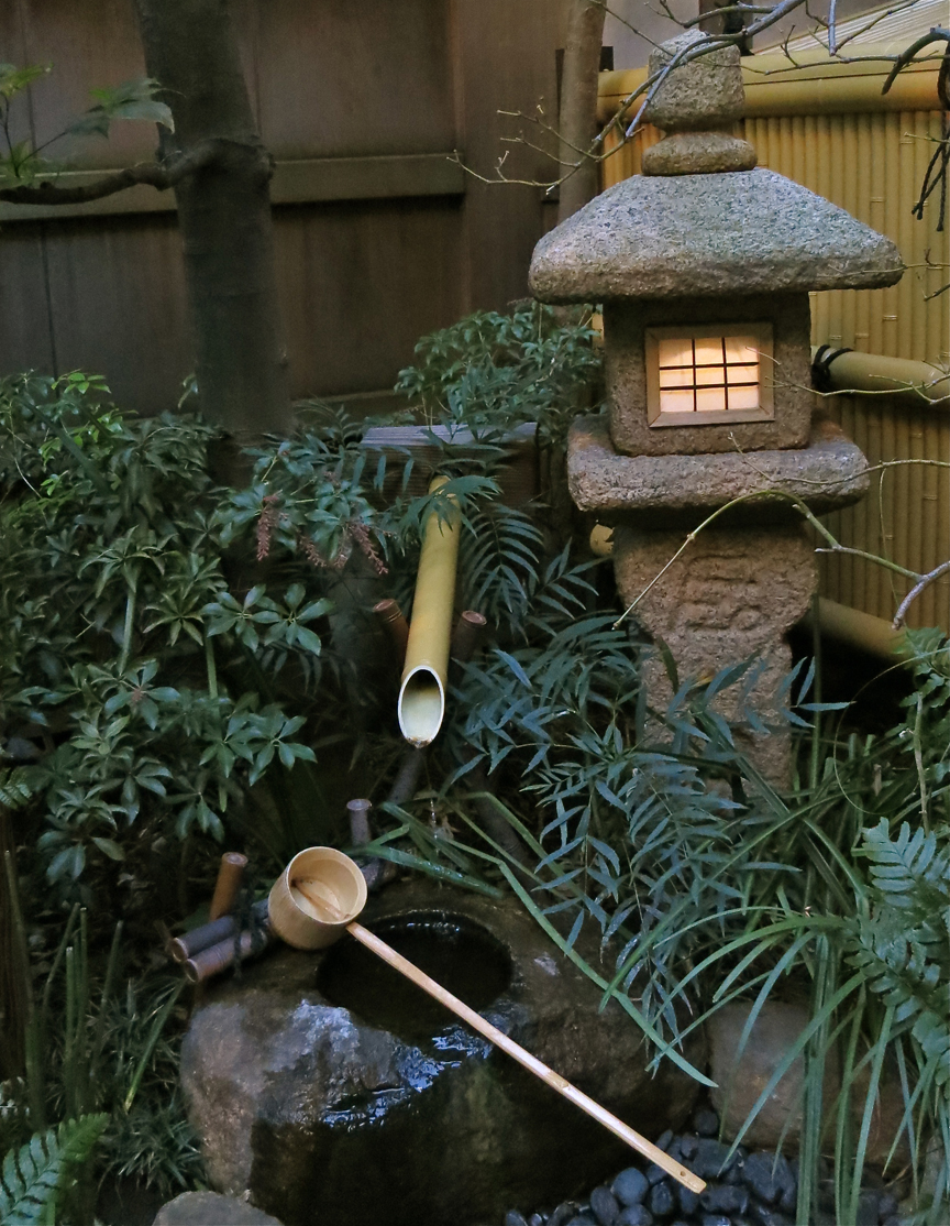 Let’s leave through the big torii gate to the right of the main shrine building. We’ll go straight down the long flight of steps with the wiggly handrail, and at the bottom (to the left) we’ll spot a garden that’s actually a musical instrument. Put your ear up to the bamboo tube angling out of the ground and you can hear the water music!